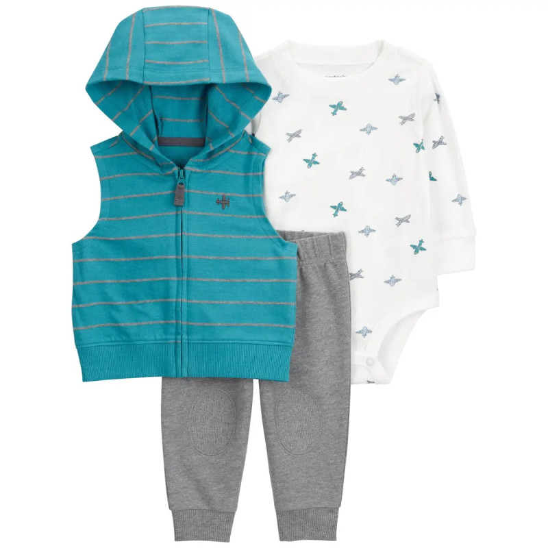 Комплект из 3 пред для мальчика(белый полукомб с самолет, серые брюки, бирюзов ж, 1R982910, Carter’s 6M