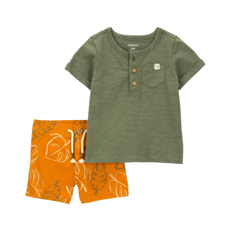 Комплект из двух предметов для мальчика (оливковая футболка, оранжевые шорты с пальмовыми листьями) 18M