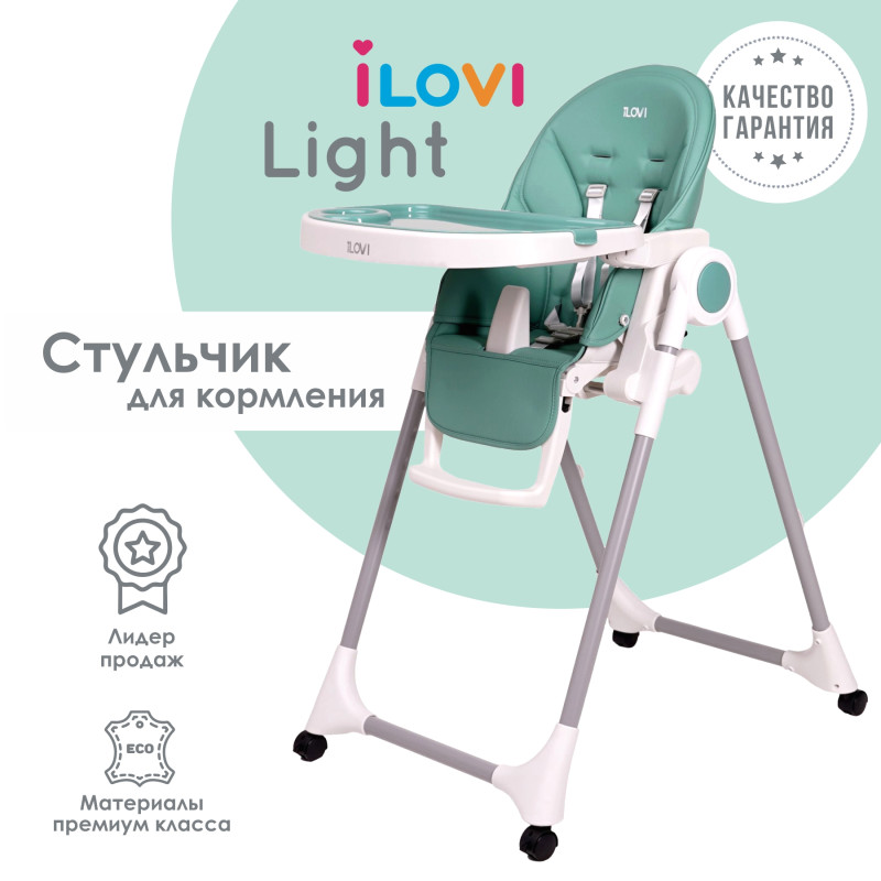 Стульчик для кормления iLovi Light. Рама из авиационного алюминия, покрытая особым матовым покрытием. Материалы: матовый пластик с тефлоновым покрытием против царапин - стульчик долго не потеряет свой первоначальный облик; чехол на сиденье из экокожи, экологичного материала. Экокожа - материал из микропористого "дышащего" полиуретана. Имеет прекрасные гигиенические свойства, не требует специального ухода, прочен, легок и износостоек. Характеристики: Максимальная нагрузка - 15 кг Спинка сиденья регулируется в 5 позициях до 135о 7 уровней регуляции сиденья по высоте 3 позиции для регуляции подставки для ног Большой столик со съемным подносом На подносе специальное углубление для стакана или бутылочки На сиденье между ног малыша есть пластиковый стопор, который предотвратит выскальзывание ребёнка 5-ти точечные ремни безопасности Складывается одним движением Очень компактен в сложенном виде Колеса со стопорами в комплекте.