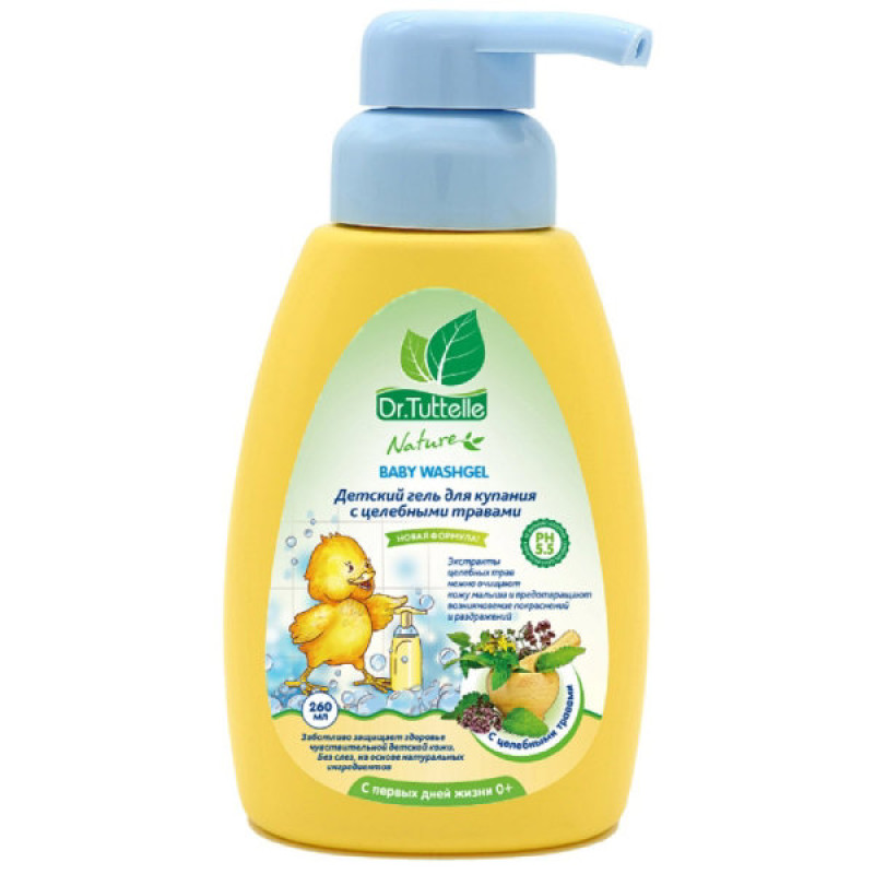 Dr.Tuttelle гель для купания с целебными травами для детей с дозатором 260 мл Рекомендации по применению Детский гель для купания Dr.Tuttelle с лечебными травами деликатно очищает, не нарушая естественный pH баланс детской кожи. Экстракты трав оказывают успокаивающее и противовоспалительное действие на чувствительную кожу малыша. Идеально подходит для ежедневного применения.