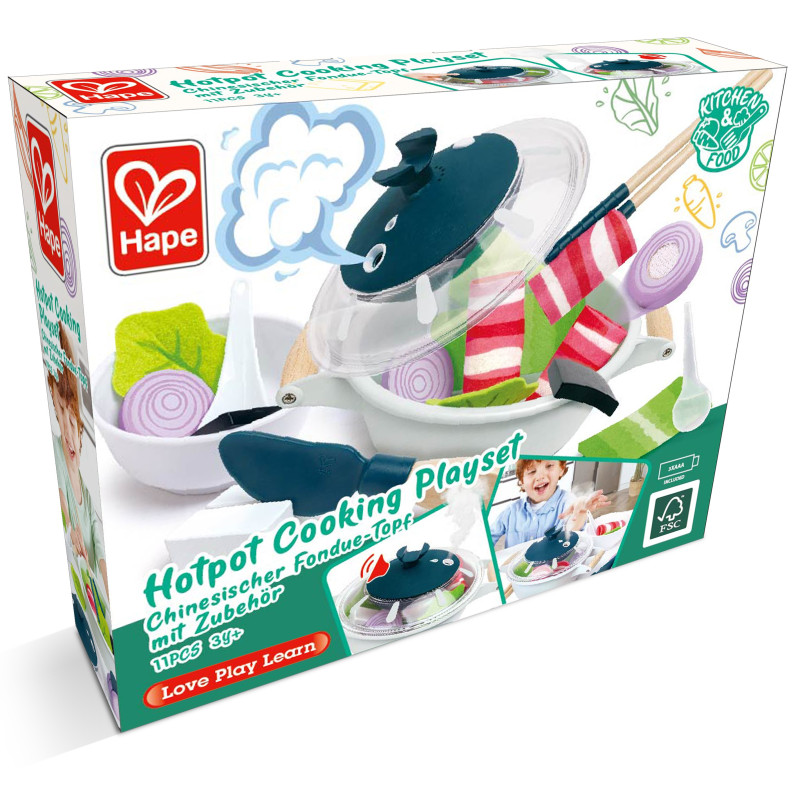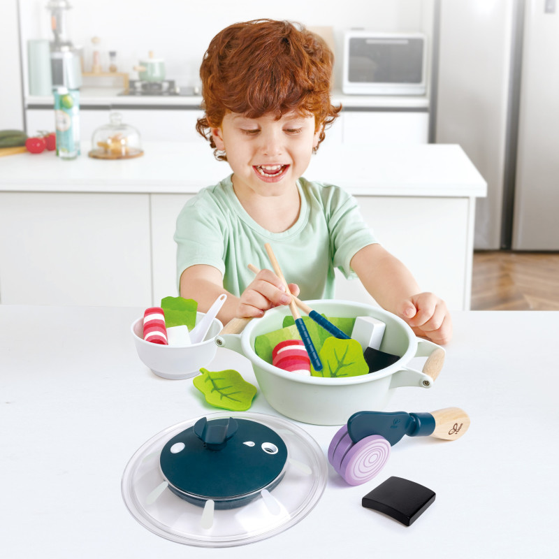 • Набор для приготовления пищи в кастрюле с реалистичным звуком и эффектом водяного пара, • Включает в себя одну кастрюлю с крышкой, одну ложку, один нож, два листа салата, одну луковицу, один кусок тофу, три говяжьих рулета, одну пару палочек для еды, три кусочка нарезанной капусты, два кусочка морских водорослей и одну маленькую миску. • Нажмите кнопку на крышке, чтобы услышать звуковые эффекты приготовления пищи. • Добавьте несколько капель воды. Через 10-15 секунд вы увидите, как поднимается прохладный туман, как настоящий пар. • ОБРАТИТЕ ВНИМАНИЕ: несмотря на то, что пар в этой игрушке прохладный и безопасный для прикосновения, мы рекомендуем вам напомнить своим малышам, что настоящий пар опасен и очень горяч. • Отличная интерактивная игрушка, позволяющая детям подражать поведению взрослых. • Отлично подходит для того, чтобы заинтересовать детей кулинарией и здоровым питанием. • Идеально подходит для развития воображения и обмена информацией, а также языковых и социальных навыков. • Помогает развивать зр