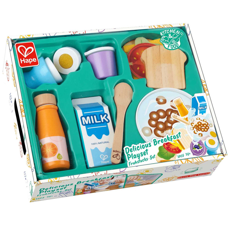 • Восхитительный игровой набор поможет детям познакомиться с различными продуктами и вдохновит их на формирование здоровых привычек питания. • В наборе различные интерактивные продукты, готовые для юных поваров. • Игровой набор, идеально подходящий для обучения детей особенностям еды, включает йогурт, молоко, апельсиновый сок, яйцо с яичной чашкой, бутерброд и реалистичную миску овсянки с деревянной ложкой. • Очаровательный набор отлично подходит для развития мелкой моторики. Крышка йогурта на липучке издает приятный хруст, а крышка бутылки щелкает, когда вы ее поворачиваете. • Сделайте свой собственный бутерброд и выберите овсянку с клубникой или шоколадом. • Игрушечный завтрак подарит часы творческого веселья. Повысьте творческие способности ребенка и помогите ему или ей развить языковые и социальные навыки с помощью ролевых игр. • Объедините этот набор с другими игровыми наборами для еды, чтобы устроить настоящий праздник. • Вся продукция Hape изготовлена из высококачественных материалов и окрашена нето