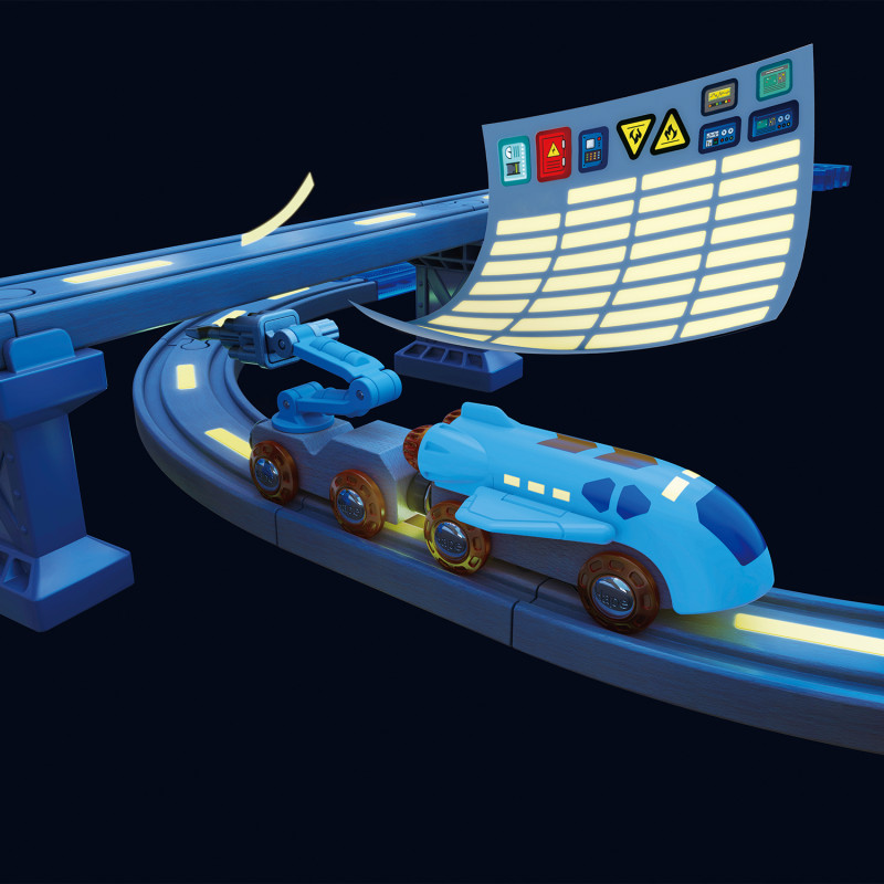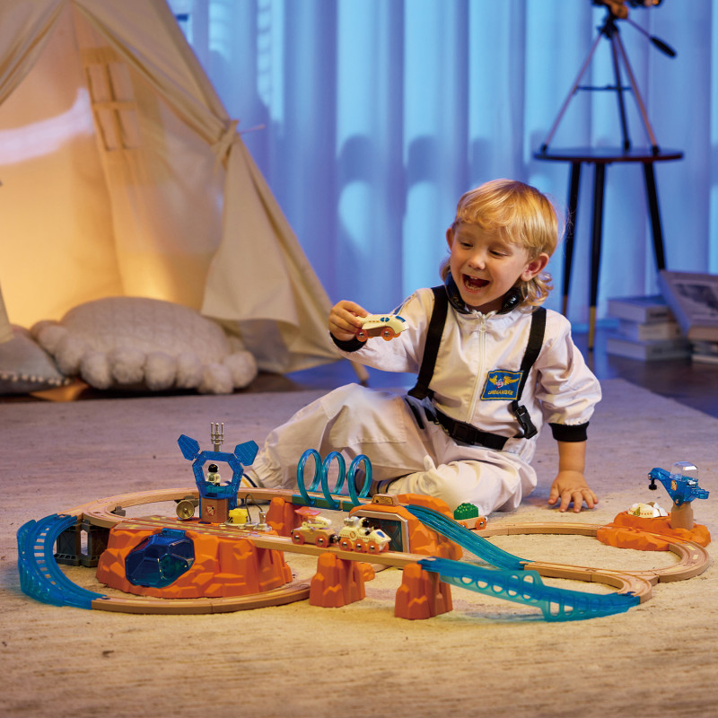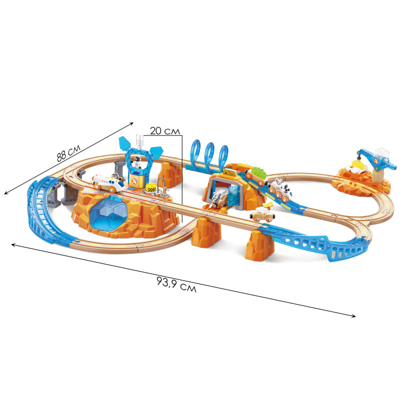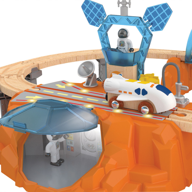 Интерактивный игровой набор "Космос" Большая Марсианская железная дорога объединяет в себе классическую железную дорогу и исследование космоса. • Откройте для себя множество функций на Марсианской базе — лаборатория, парковка, радар, съемные антенны, солнечные панели и заправочная станция. • Посадочная площадка базы постепенно загорается светом, когда поезд проезжает мимо. • Поезд со звуковыми эффектами 2 в 1 - поезд и космический шаттл (челнок). • Создайте яркую игровую обстановку с помощью светящихся в темноте наклеек, которые можно наклеить на элементы железной дороги. • Комплектация: 19 деревянных рельсов, кран, поезд-шаттл, 4 транспортных вагона, 2 грузовых блока, Марсианская база, радар, антенна, гора, S-образный рельс, короткий рельс, 2 поднимающихся больших рельса, 4 моста, 3 горных моста, 3 спиральных кожуха, 2 фигурки космонавтов, бумага со светящимися наклейками; всего 48 элементов. • Возрастные рекомендации: для мальчиков и девочек от 3 лет.