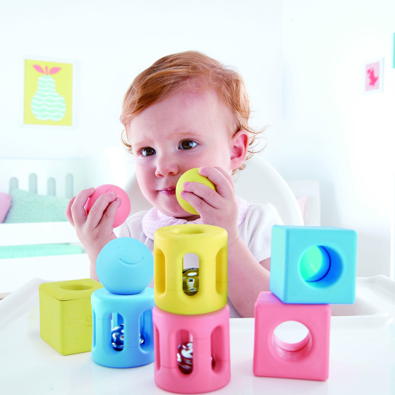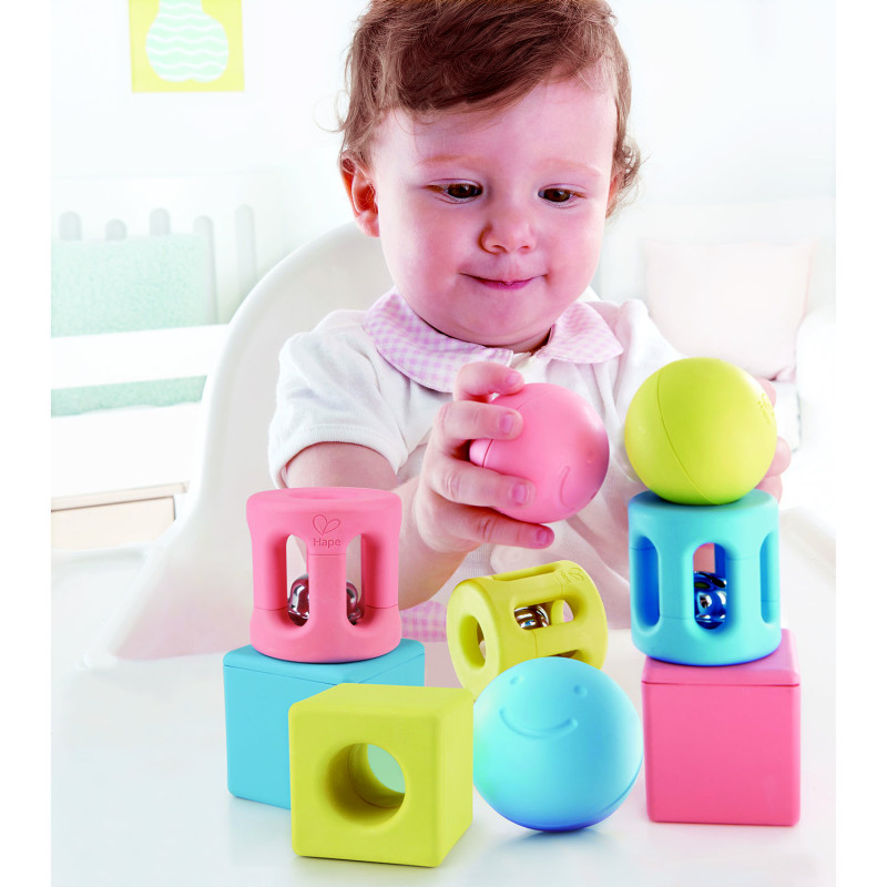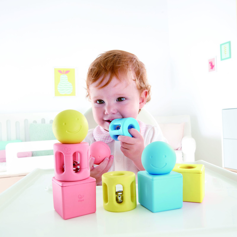 Игрушка для малышей конструктор - погремушка "Улыбка" нежного цвета идеально подходит для маленьких ручек и поможет вашему ребенку развить зрительно-моторную координацию при встряхивании и игре. Изготовлен из материалов на основе риса. Встряхните, чтобы развлечь малыша звуками, которые издают разные формы. По мере того, как ваши дети растут, поощряйте их выполнять некоторые базовые действия по складыванию и сортировке, а также получайте удовольствие, рассматривая цветные линзы кубика. • Геометрическое трио погремушек включает в себя один круглый желтый мяч, один синий мяч и один розовый мяч с радостным лицом, который содержит деревянную бусину, три цилиндрические игрушки разного цвета с колокольчиками и три квадратные игрушки - одна розовая, одна синяя и одна желтая, которые содержат пластиковые бусины и линзу соответствующего цвета, через которую дети могут смотреть. • Изготовлен из материалов на основе риса. • Профессионально разработанные размеры и формы, идеально подходящие для маленьких ручек.