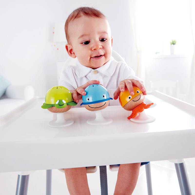 Набор погремушек Hape очарует вашего малыша разнообразными звуками, яркими цветами и подводными животными. Более того, с их удобными присосками играть можно где угодно и когда угодно! Продуманно разработанные детские игрушки стимулируют чувства ребенка и побуждают к открытиям. Позвольте вашему малышу немного изучить свою геометрическую погремушку, позвольте ему улучшить свои навыки крупной моторики и стимулировать слух, пока он трясет погремушкой. Продукция Hape разработана для поощрения и стимулирования детей на всех этапах развития. Каждый раз, когда ваш ребенок трясет погремушкой, она будет издавать звук, и по мере того, как ваш ребенок начнет это понимать, его уверенность в себе улучшится, и он попытается применить ее в других областях своей напряженной маленькой жизни. • ТРИ ДРУЖНЫХ МОРСКИХ СУЩЕСТВА: набор детской погремушки состоит из трех милых и красочных морских существ. Вашему малышу будет очень весело играть с черепахой, осьминогом и китом. • УНИКАЛЬНЫЕ ЗВУКИ: Каждая погремушка издает уникальный зв