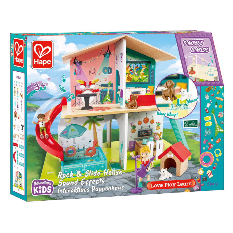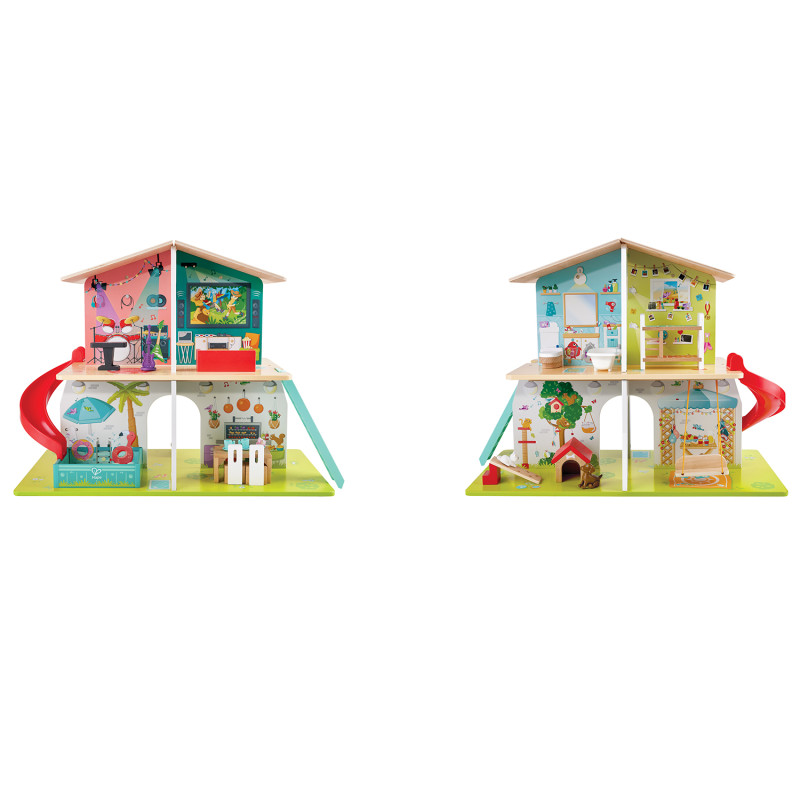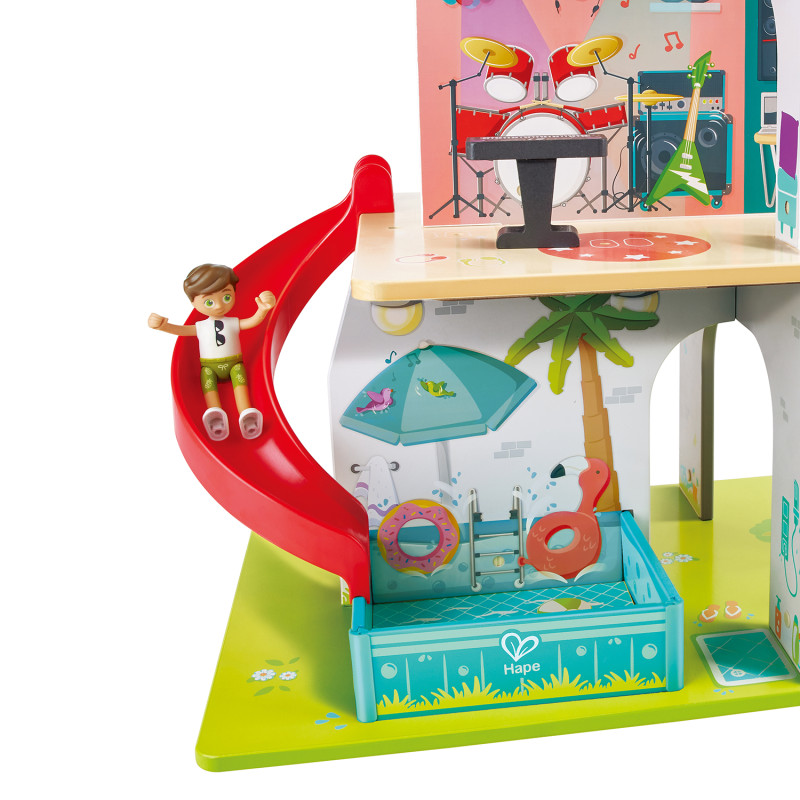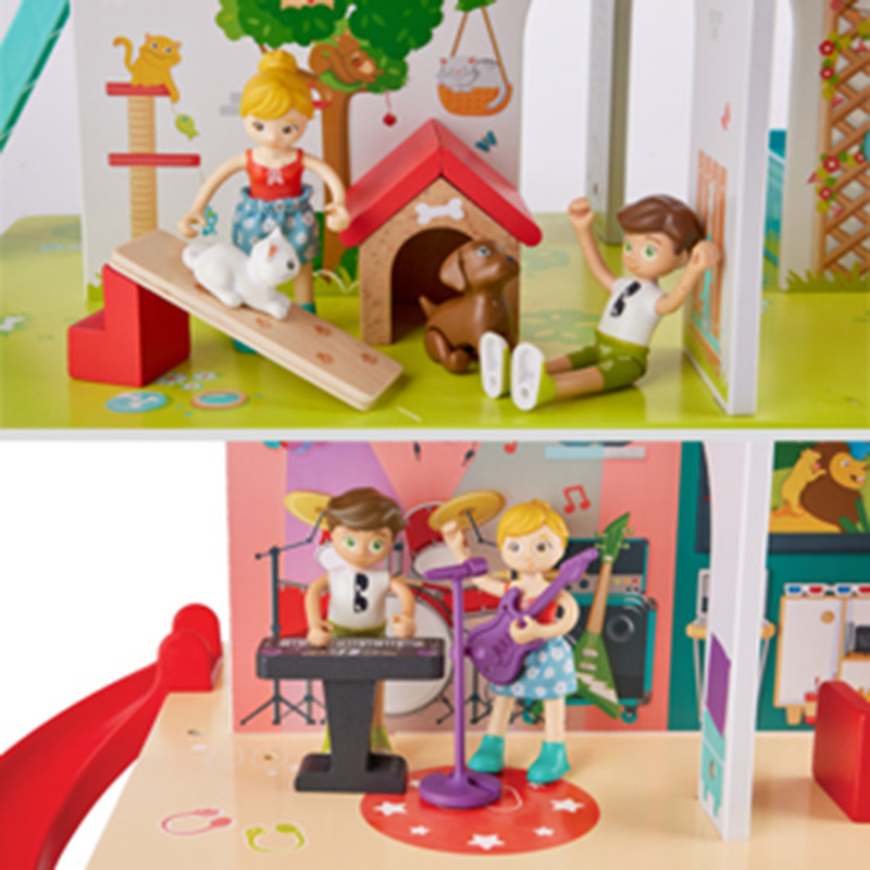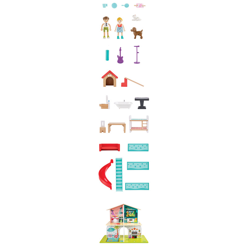 • Этот игровой домик - дом детской мечты, состоящий из двух этажей, восьми комнат и двух мероприятий на свежем воздухе. Открытый дизайн позволяет нескольким детям мгновенно получить доступ ко всем восьми комнатам! • Наполните просторный дом девятью захватывающими повседневными домашними звуками, включая раковину, фен, смыв унитаза, кукареканье петуха и многое другое. Запустите каждый звук, просто расположив фигуры так, чтобы их ступни покрывали один из светодиодных фонарей на полу. • Пусть время вашего ребенка оживет! Обилие реальной мебели и аксессуаров, в том числе: пианино, гитара, микрофон, диван, стол, стулья, посуда и чашки, шашлычки для рыбы, унитаз, двухъярусная кровать, горка, качели, собака и кошка, а также фигурки девочек и мальчиков. • С таким большим игровым потенциалом и реалистичными звуковыми эффектами под одной крышей - детям никогда не хватит историй, чтобы рассказать! • Этот очаровательный игровой домик поможет развить у малышей творческие навыки ролевой игры и социальные навыки. • Изготовл