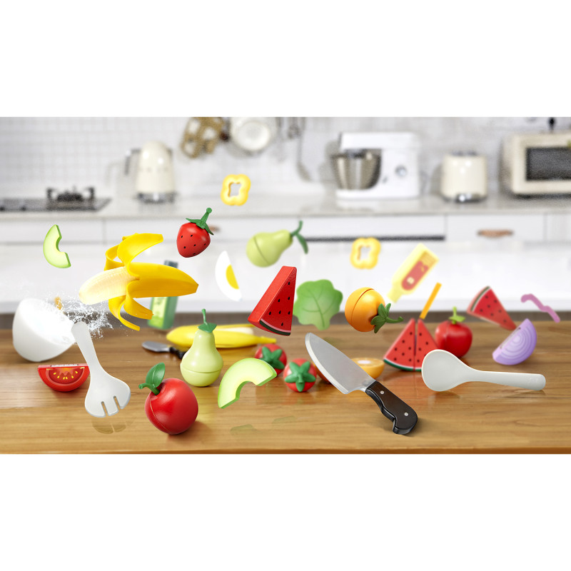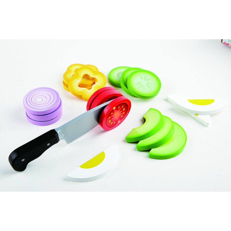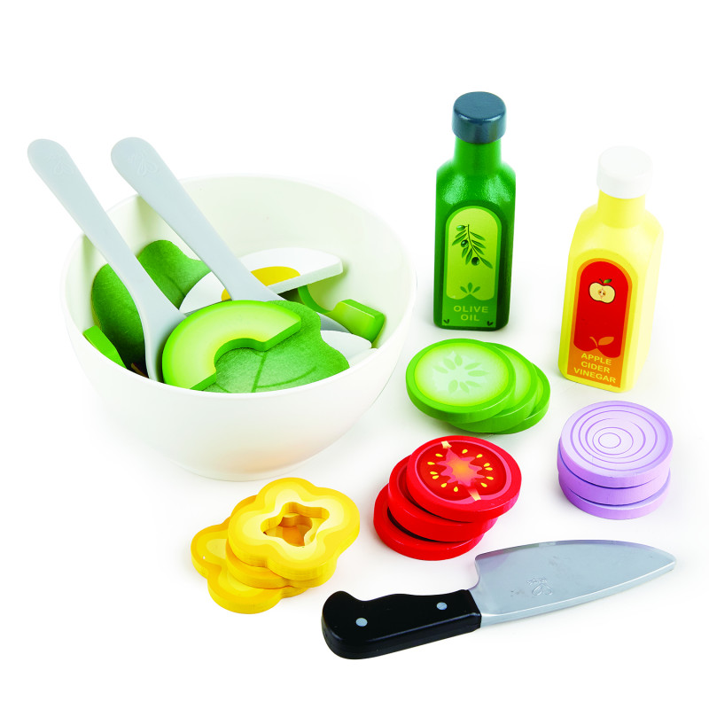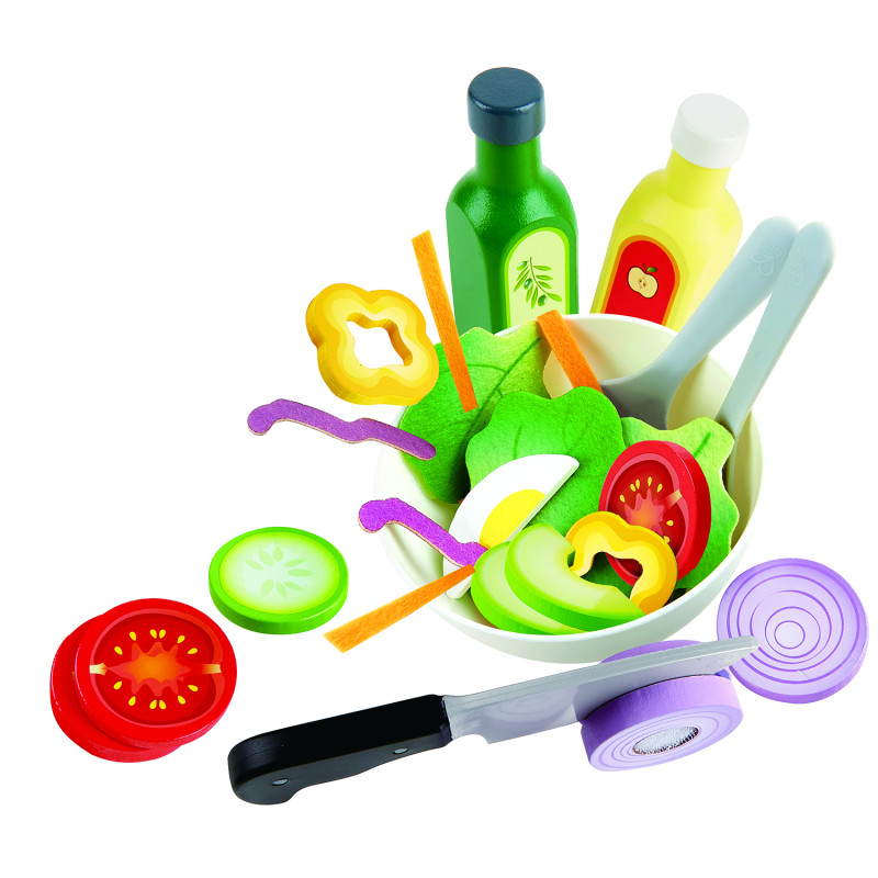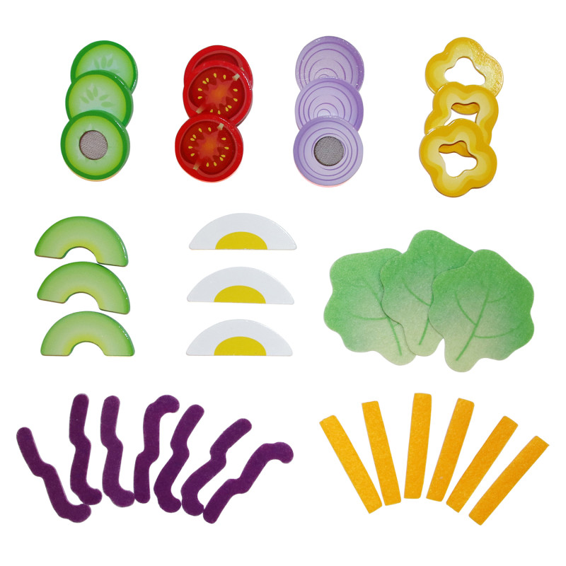 Приготовьте здоровую еду с этим фантастическим набором для приготовления салата! Включает в себя кусочки яйца, авокадо, огурца, помидора, лука и других овощей, которые можно нарезать с помощью реалистичного игрового ножа. Также включает в себя одну салатницу, одну ложку и вилку и две бутылки заправки!