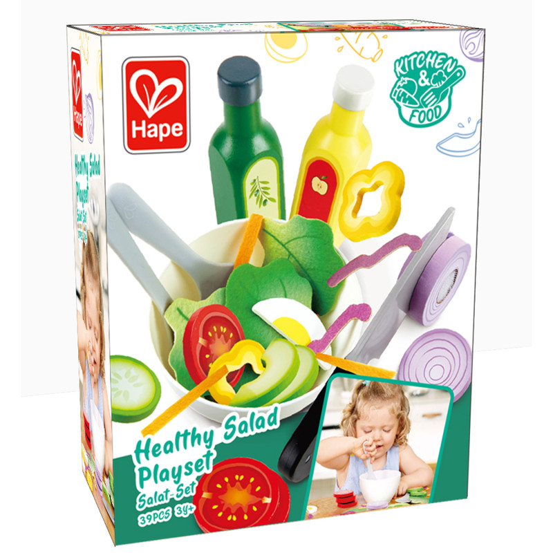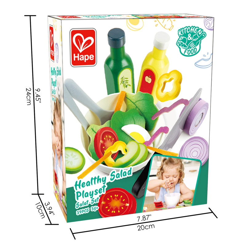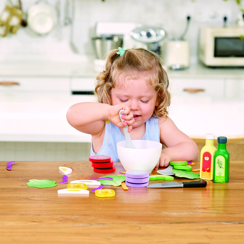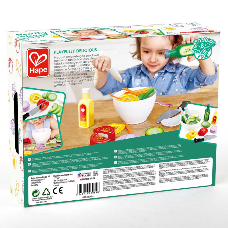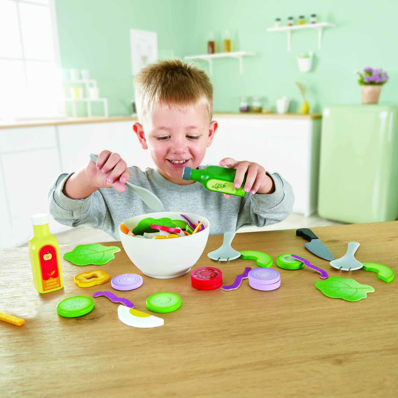 Приготовьте здоровую еду с этим фантастическим набором для приготовления салата! Включает в себя кусочки яйца, авокадо, огурца, помидора, лука и других овощей, которые можно нарезать с помощью реалистичного игрового ножа. Также включает в себя одну салатницу, одну ложку и вилку и две бутылки заправки!