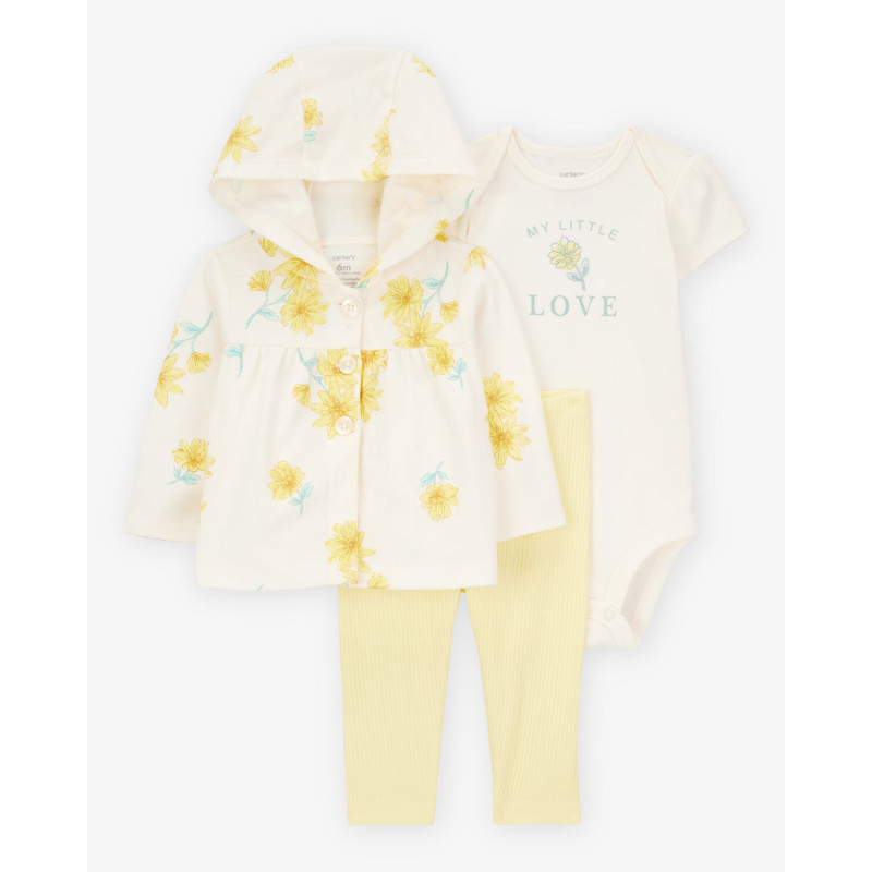 Комплект из трех предметов для девочки (боди с надписью, желтые брюки, кардиган с капюшоном с цветам 6M