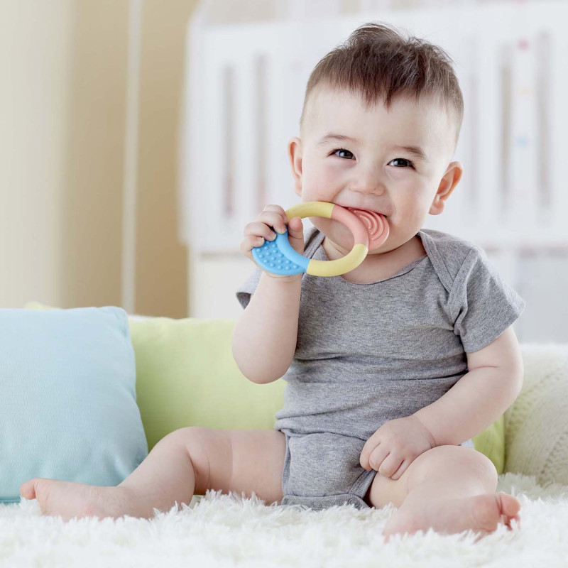 Это жевательное кольцо для прорезывания зубов, изготовленное из безопасного материала на основе риса, легко брать и держать.