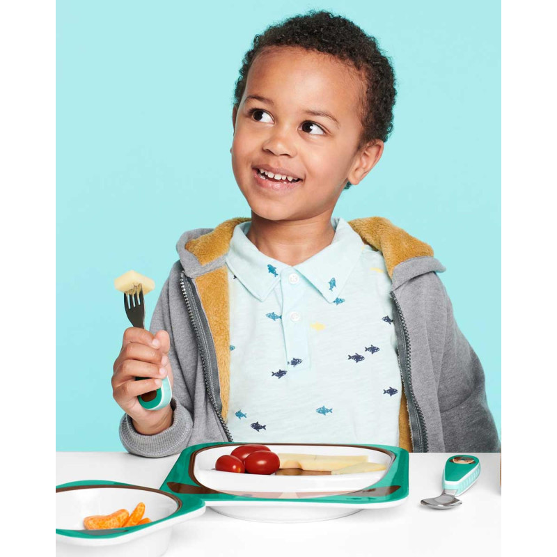 Яркие столовые приборы с прорезиненной рукояткой и яркими животными Skip Hop: вилка и ложка - идеально подходят для маленьких ручек ребенка и быстро научать его принимать пищу самостоятельно. Основание из нержавеющей стали делает их похожими на взрослые столовые приборы, что очень нравится малышам, которые хотят использовать предметы обихода как у родителей.