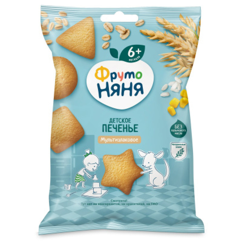 "ФрутоНяня" Печенье 50г растворимое мультизлаковое, обогащенное витаминами и минеральными веществами для питания детей раннего возраста. О продукте: Польза натурального печенья! 100% натуральные злаки Без растительных жиров Печенье с героями «ФрутоНяня» в форме четырех фигур. Форма печенья и герои повторяются на упаковке в виде специальных отверстий, что позволяет в игровой форме изучать животных и геометрические фигуры.