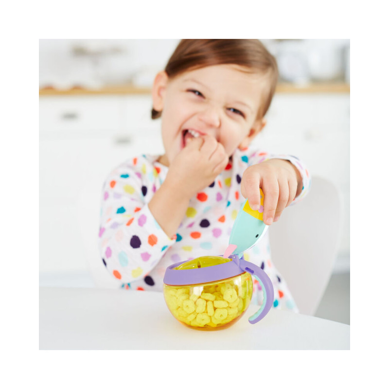 Теперь малыш может перекусить когда ему вздумается самостоятельно! А так же забудьте о крошках в сумке или коляске! Контейнер-непросыпайка с крышкой поможет ему в этом, ведь он устроен так, что даже если емкость нечаянно перевернется все его содержимое останется внутри, благодаря специальным силиконовым лепесткам. Они мягкие и подвижные, что позволяет без усилий достать с глубины любимый снек. Внешняя крышка с веселым животным поможет продуктам всегда оставаться свежими. Эргономичная ручка имеет удобную для детских пальчиков форму и антискользящую поверхность, а прозрачный корпус позволит определить количество оставшихся снеков.