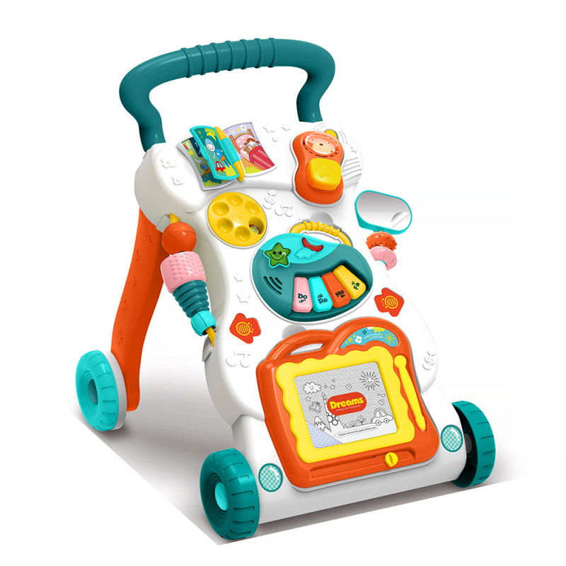 Развивающий игровой центр совмещает в себе 2 функции: каталка-ходунки и столик. Каталка-ходунки будет отличным помощником в обучении малыша ходьбе и сделают этот процесс увлекательным. Высота руля регулируется. Колеса оснащены нескользящей резиновой вставкой и ручкой, которая их блокирует. Интерактивная панель оснащена музыкальными и световыми эффектами, а также другими развивающими деталями: сортер, шестерёнки, погремушку, корзину с мячиками и бусинки. Пианино в виде краба имеет 3 режима работы, которые переключаются с помощью кнопки в виде кита. При включении воспроизводится мелодия. В первом режиме воспроизводятся звуки клавиш пианино, во втором кнопки воспроизводят мелодии (по 1 вариации на каждую), а в третьем - мелодия воспроизводится по частям за счет поочередного нажатия на ту же самую клавишу. Клавиши подсвечиваются во время игры. Кнопки в виде осьминога, морской звезды, ракушки воспроизводят мелодии (каждая кнопка по разных 5 вариаций).